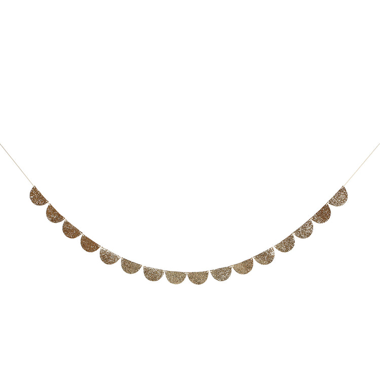 This beautiful gold scallop flag garland will had some sparkle to your party. Featuring half-moon pennants embellished with chunky gold glitter, suspended on a natural finish cotton tape, this garland is a great way to add glitz and glamour to any occasion.