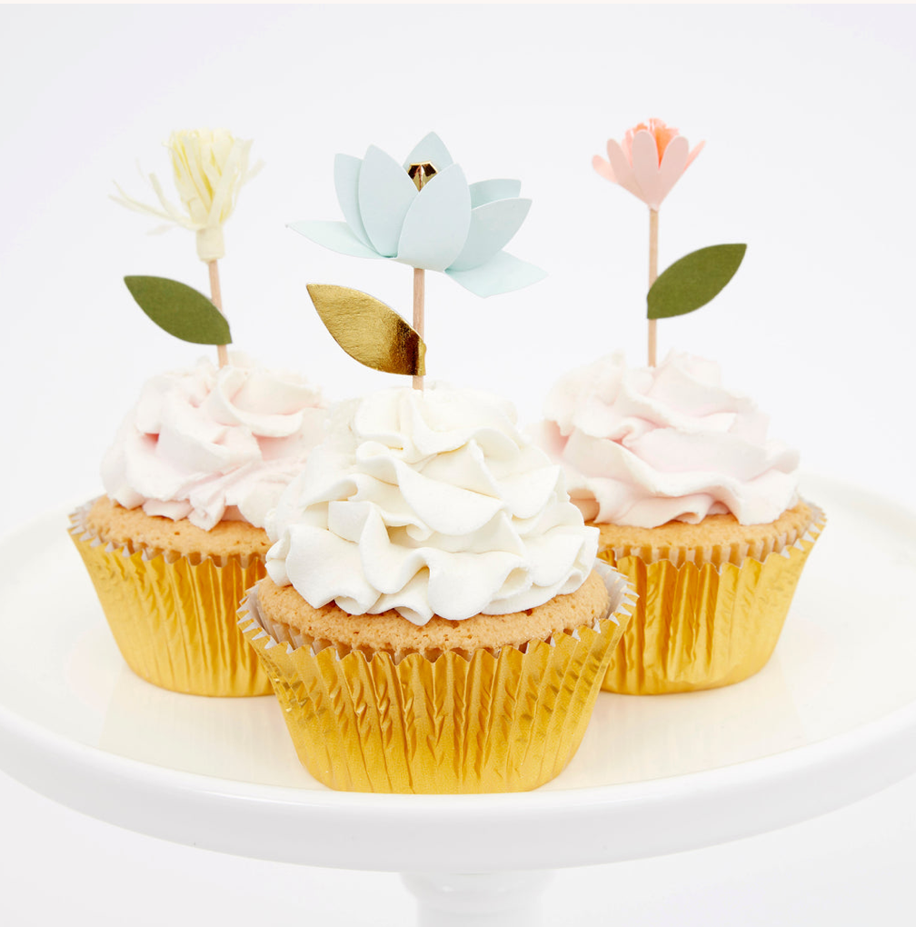 This beautiful set of flower bouquets is a pretty and easy way to decorate your cupcakes. The toppers are carefully crafted from brightly coloured crepe paper and look gorgeous teamed with the shiny gold foil cases.
